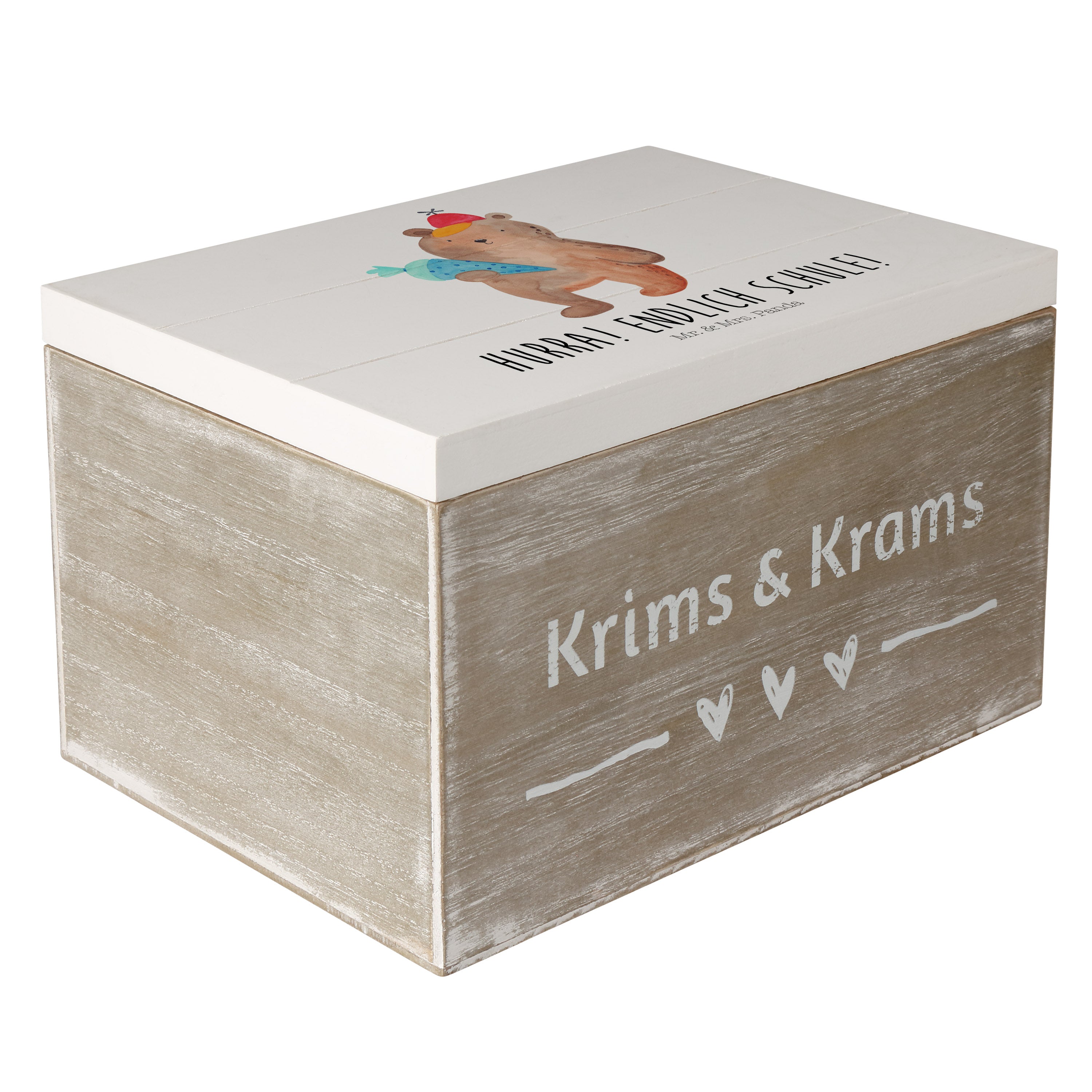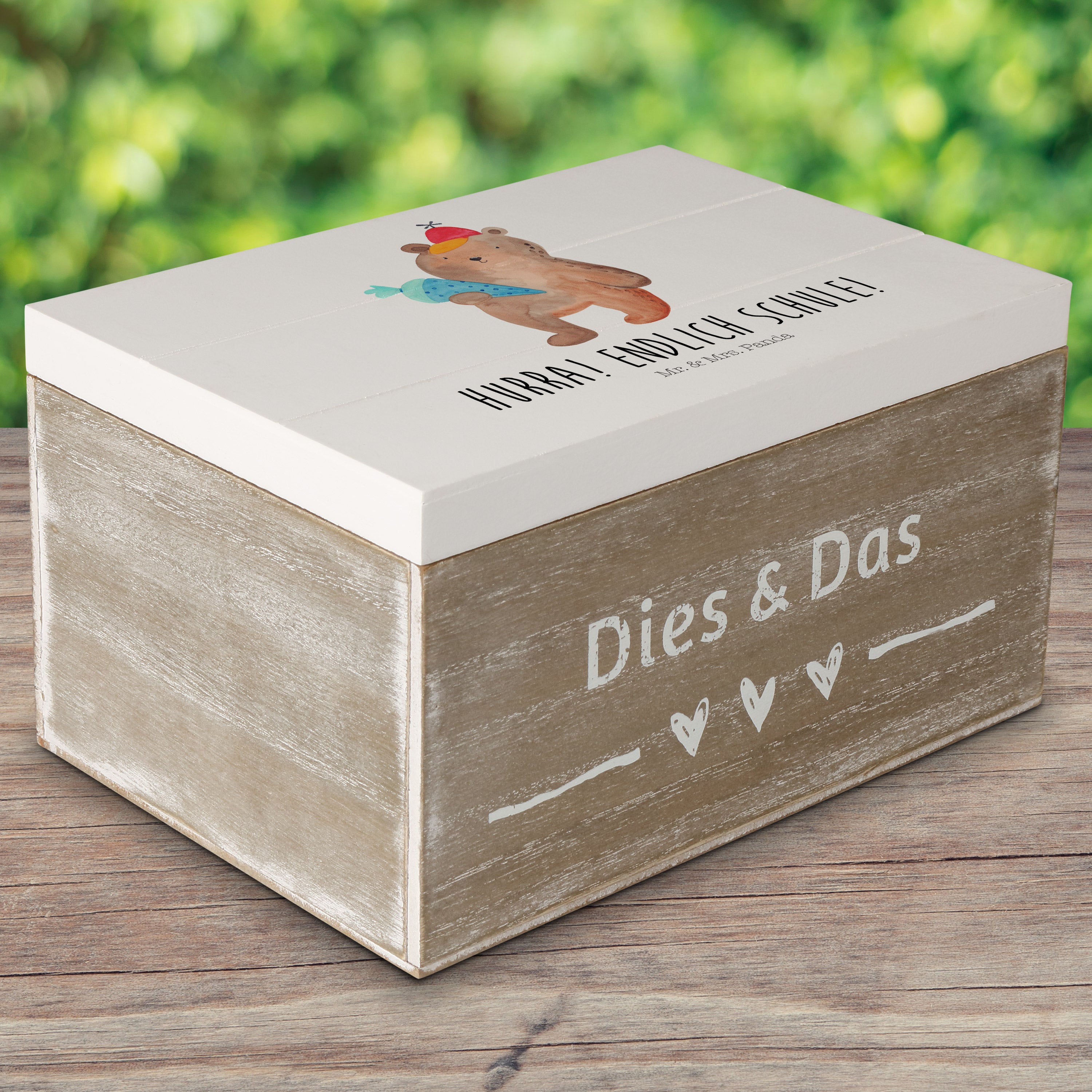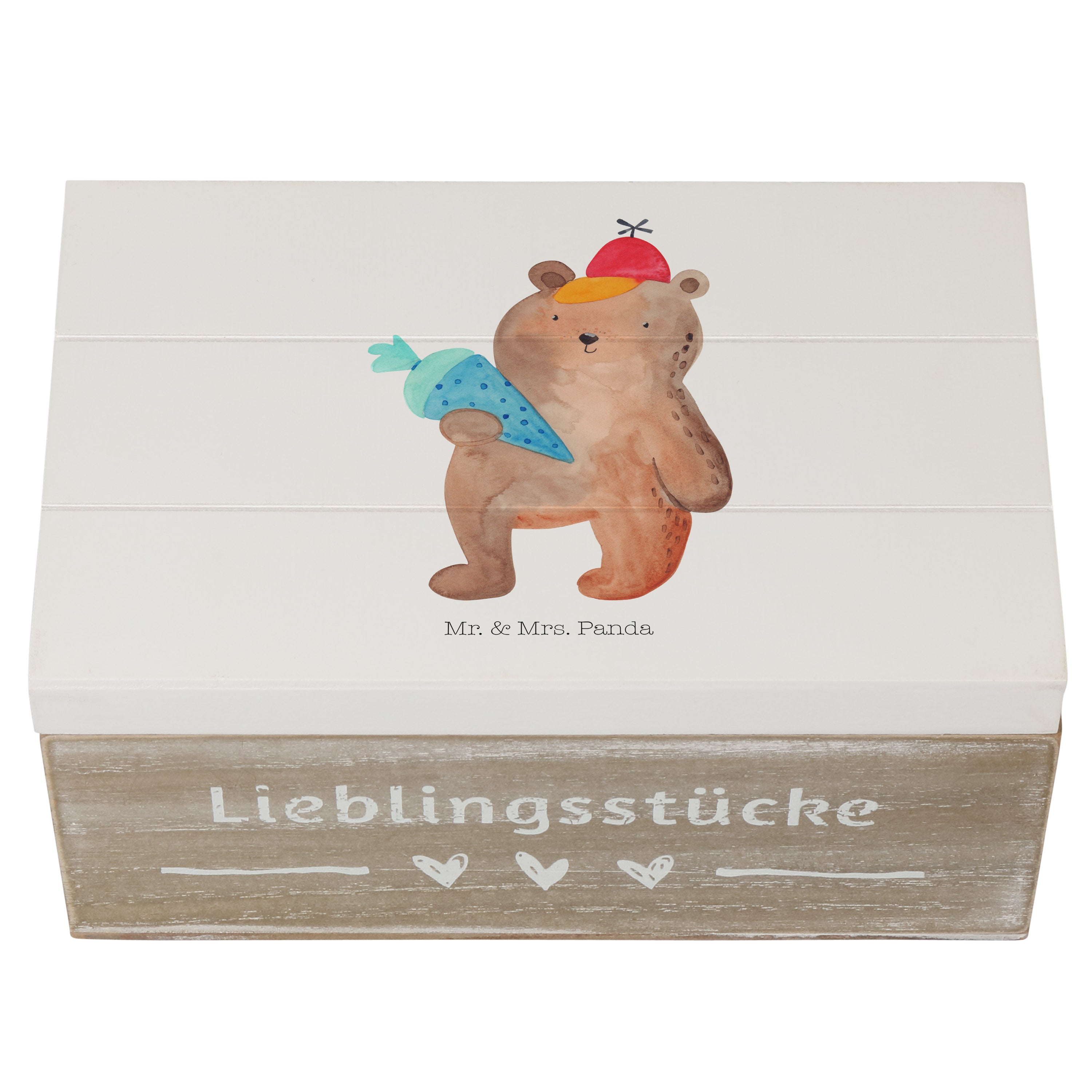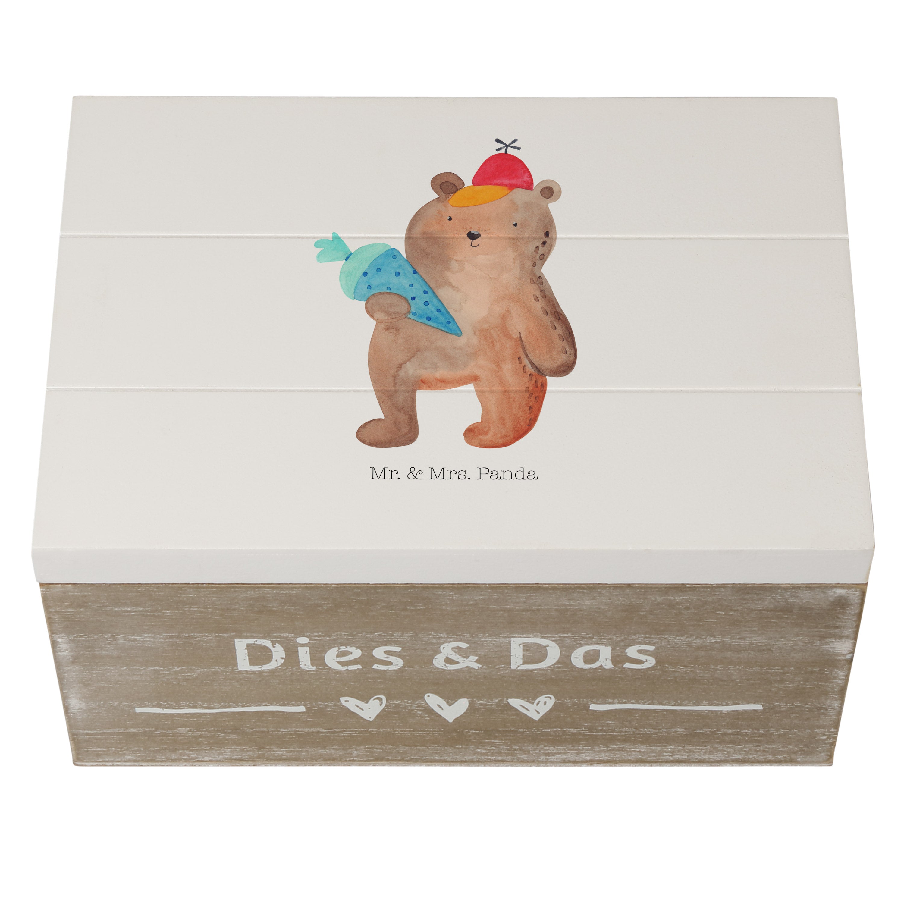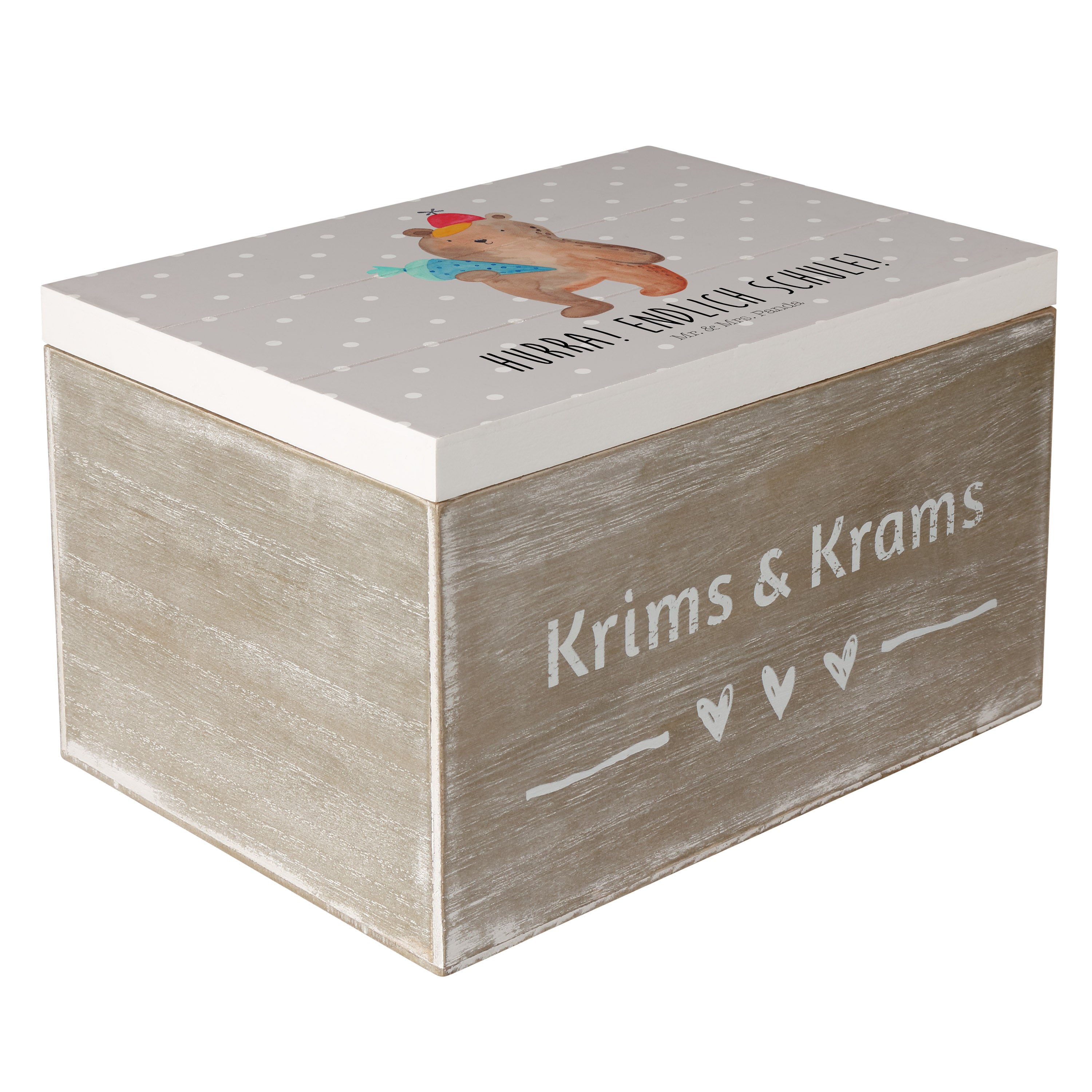 Holzkiste Bär mit Schultüte - 25 x 18 cm - mit Spruch - Grau Pastell
