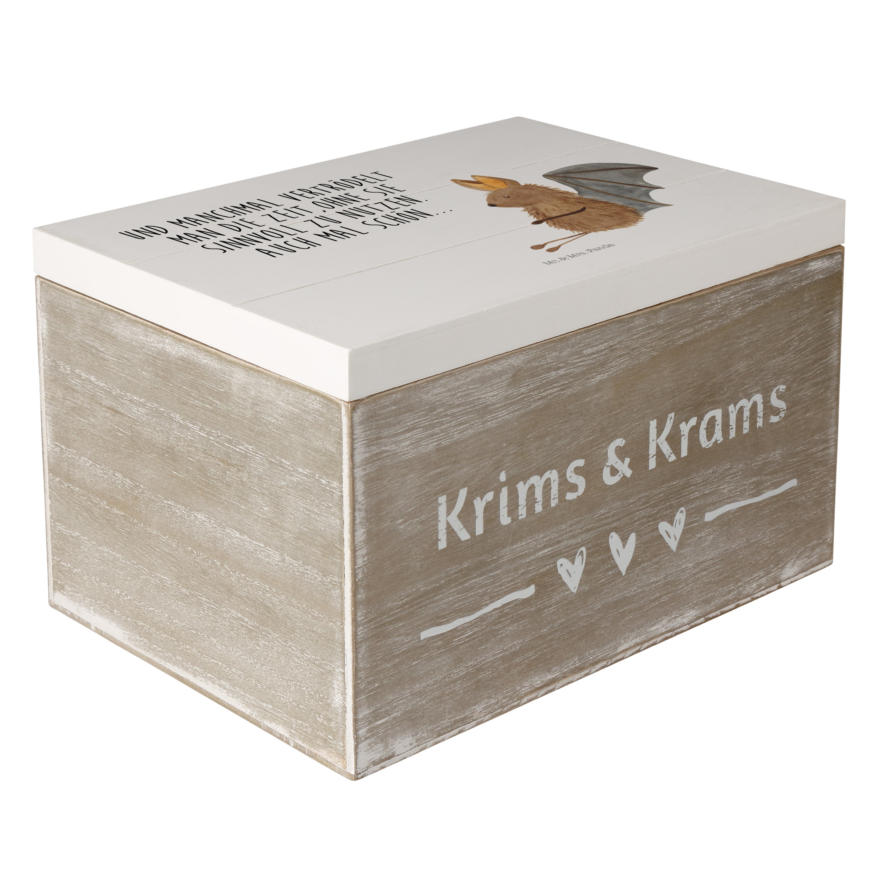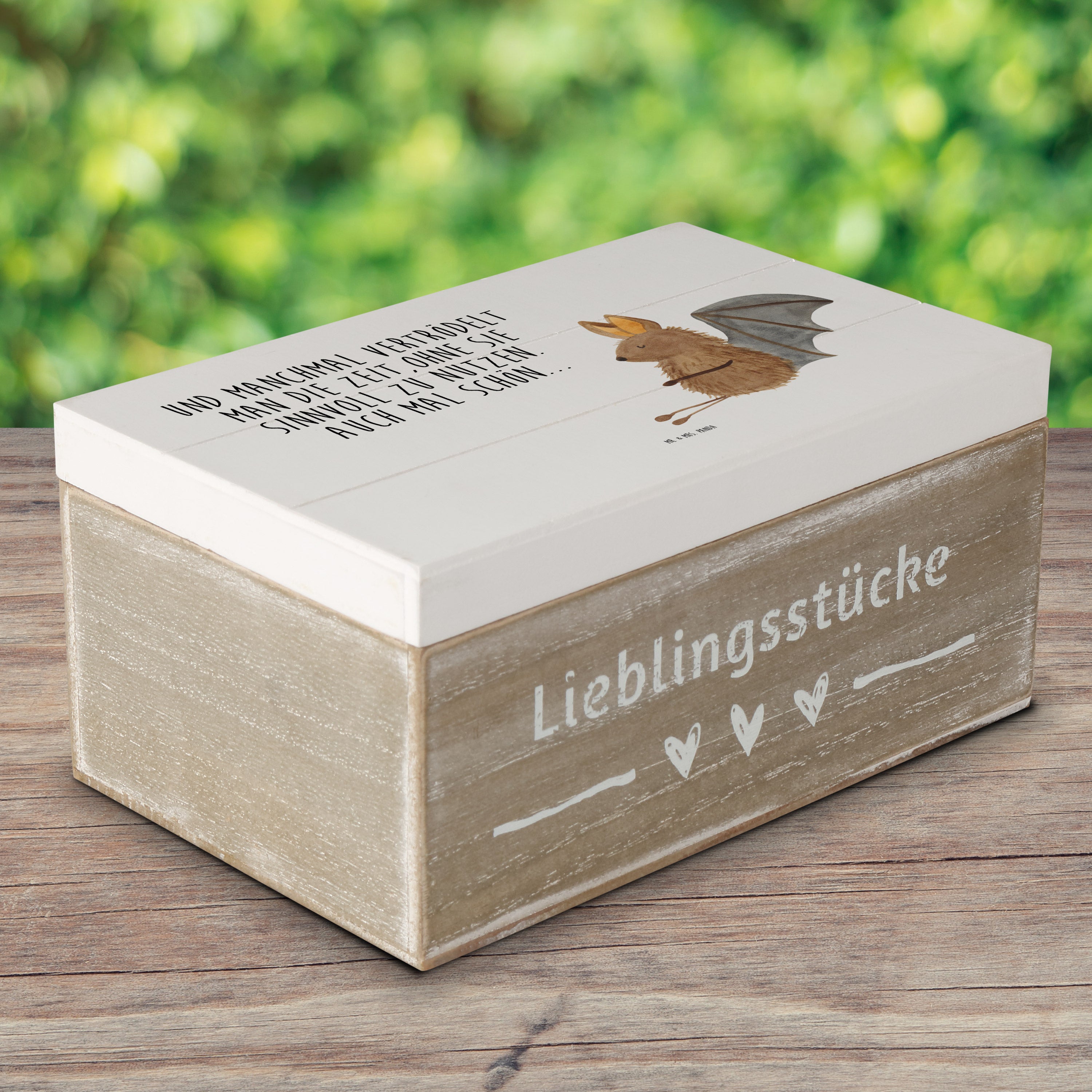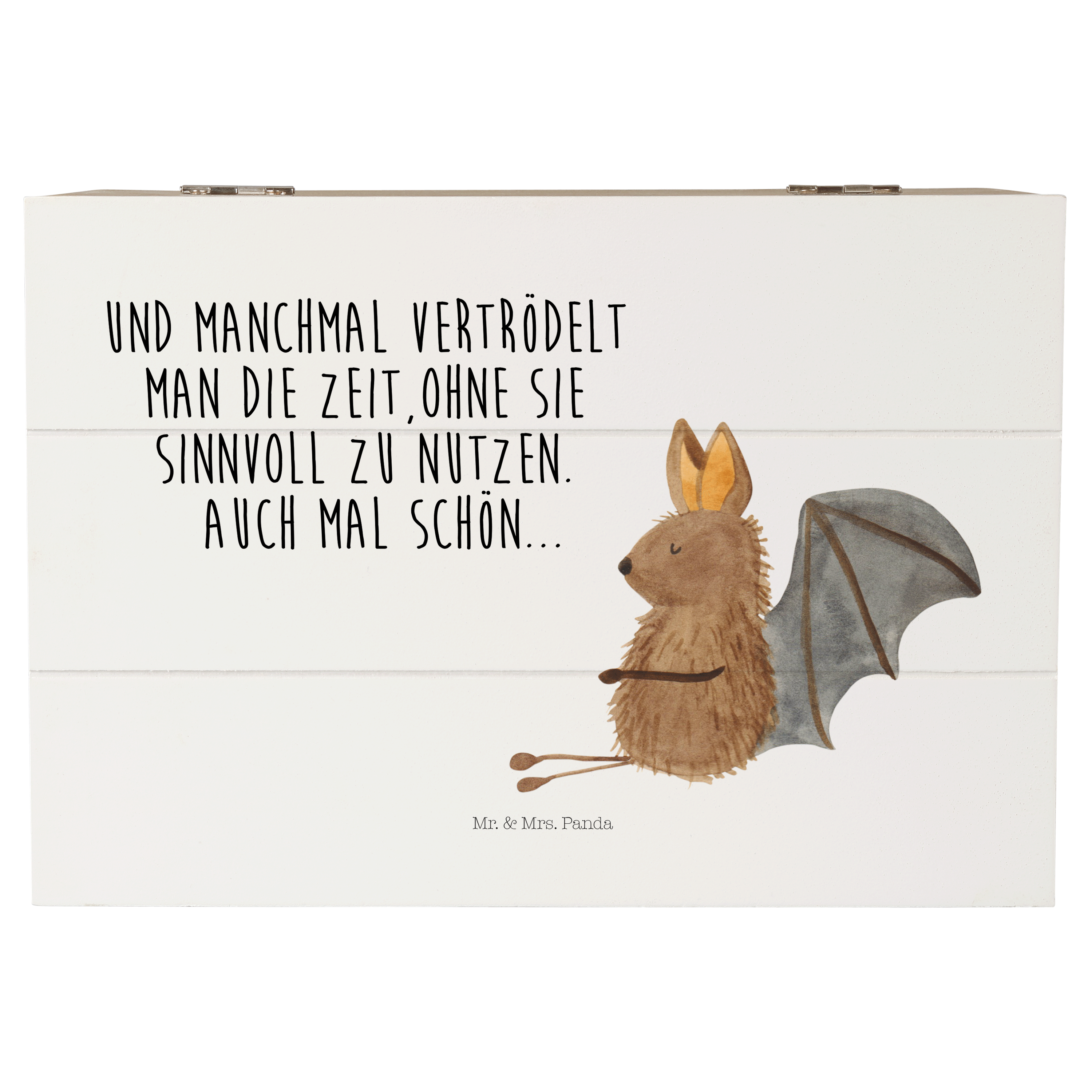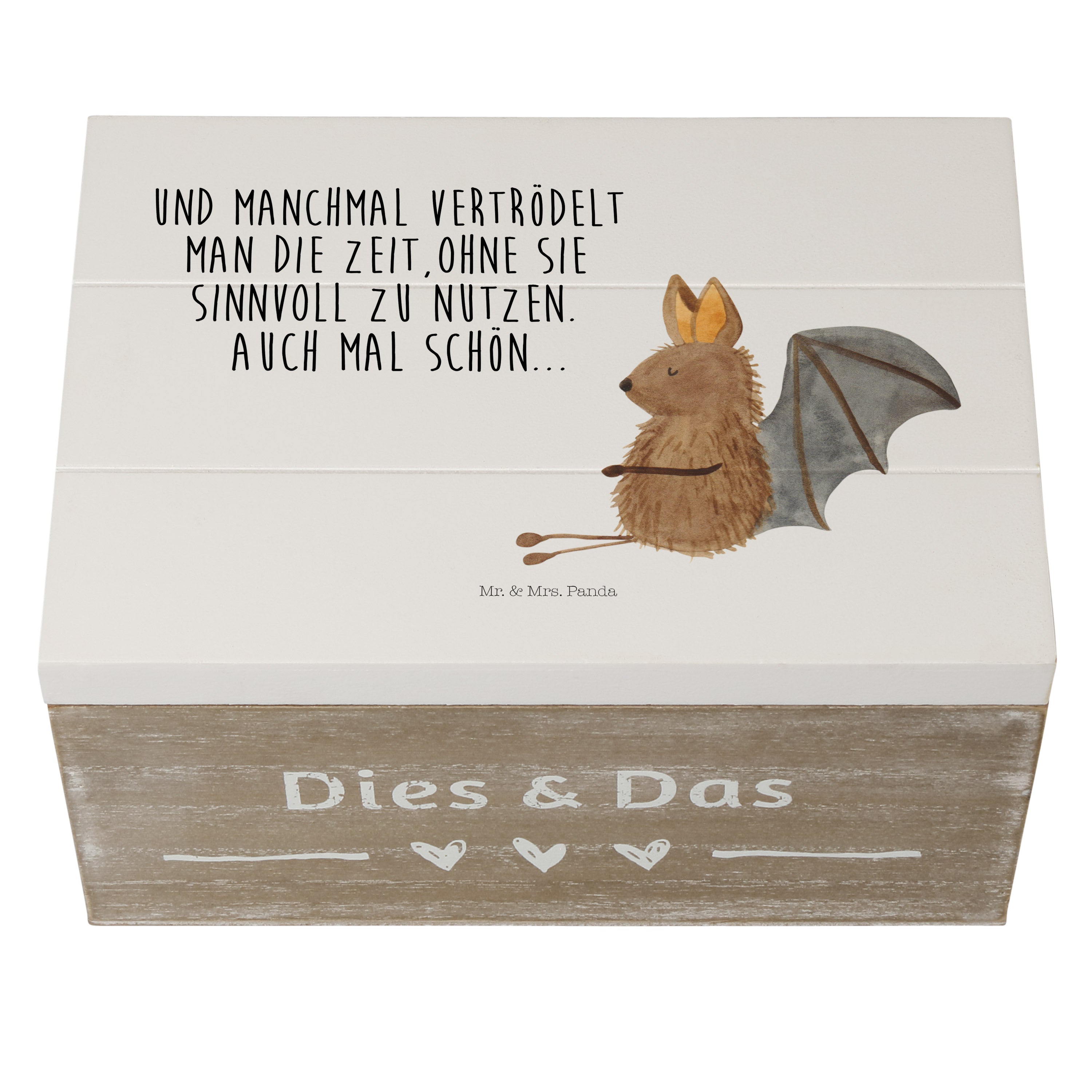 Holzkiste Fledermaus sitzend - 25 x 18 cm - mit Spruch - Weiß