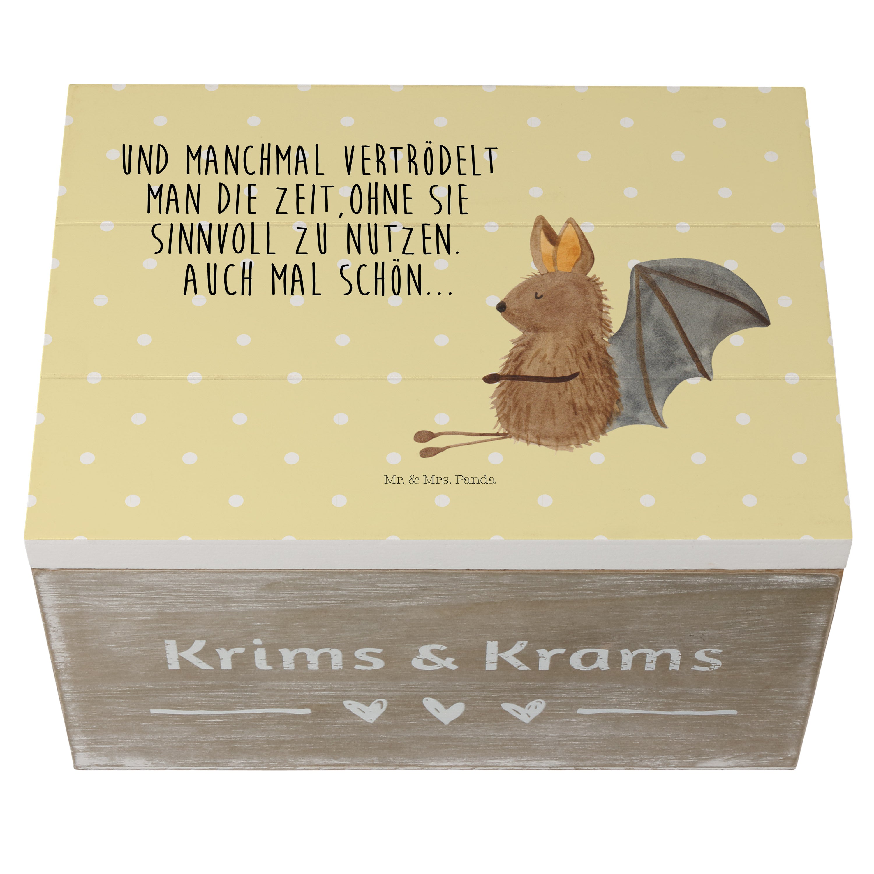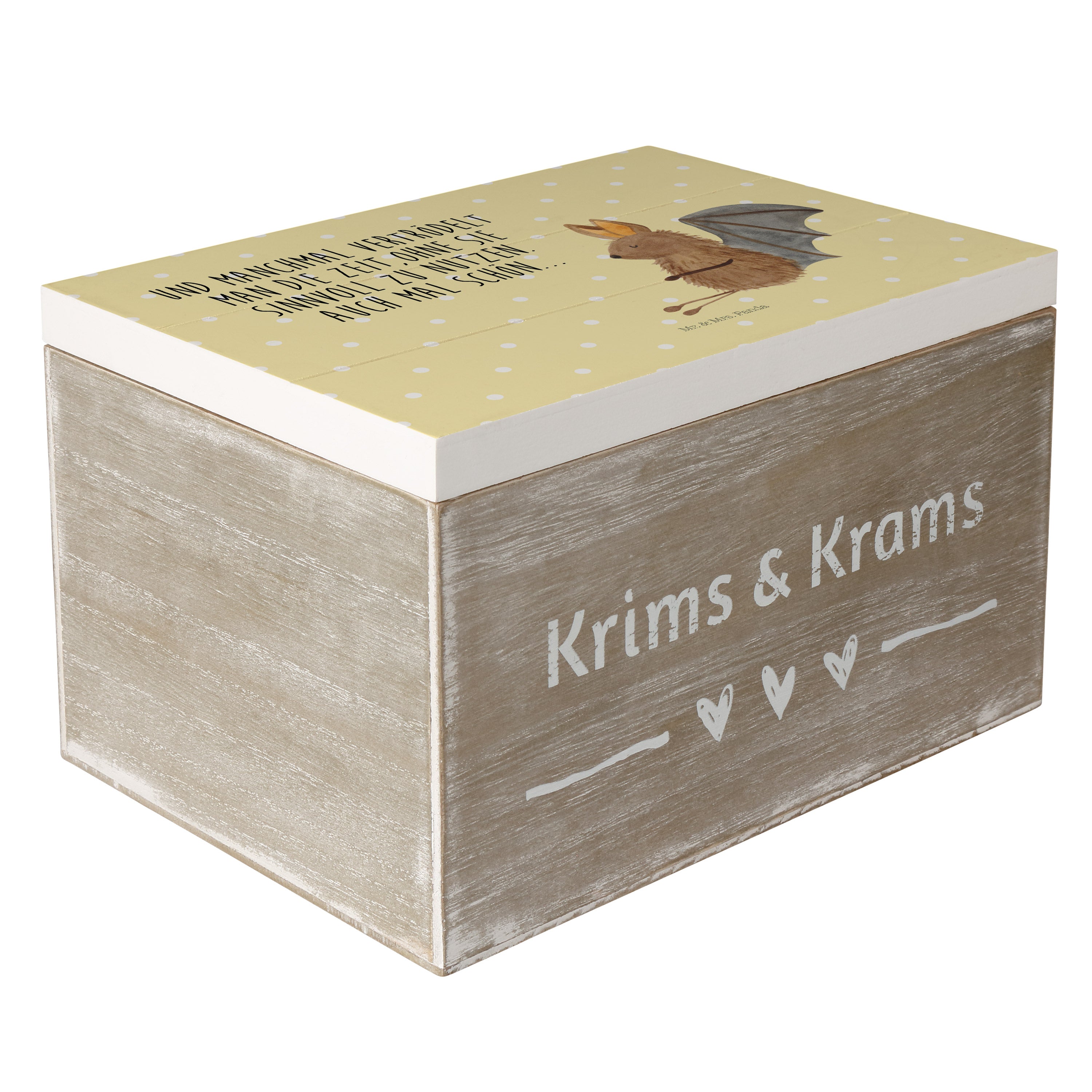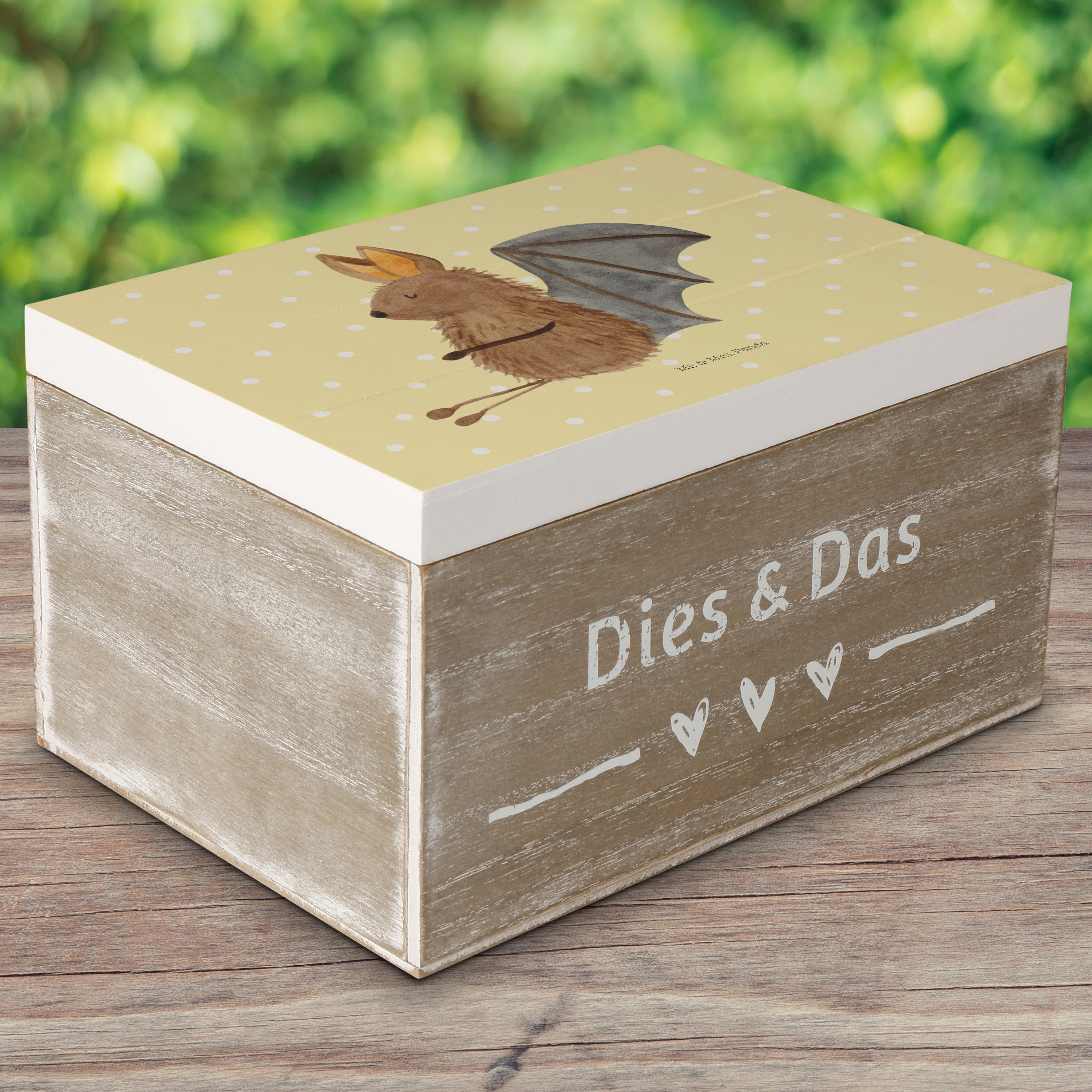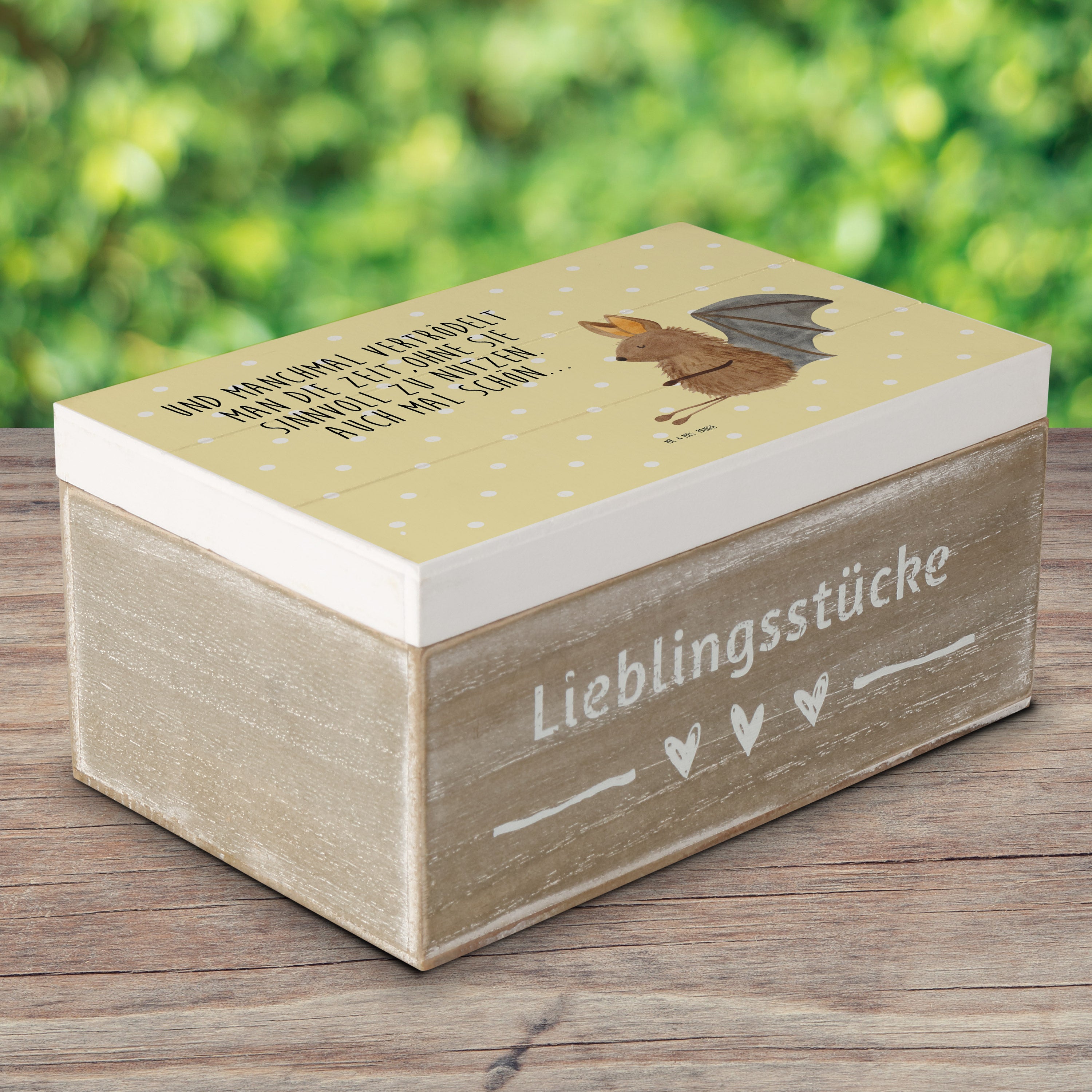 Holzkiste Fledermaus sitzend - 25 x 18 cm - mit Spruch - Weiß