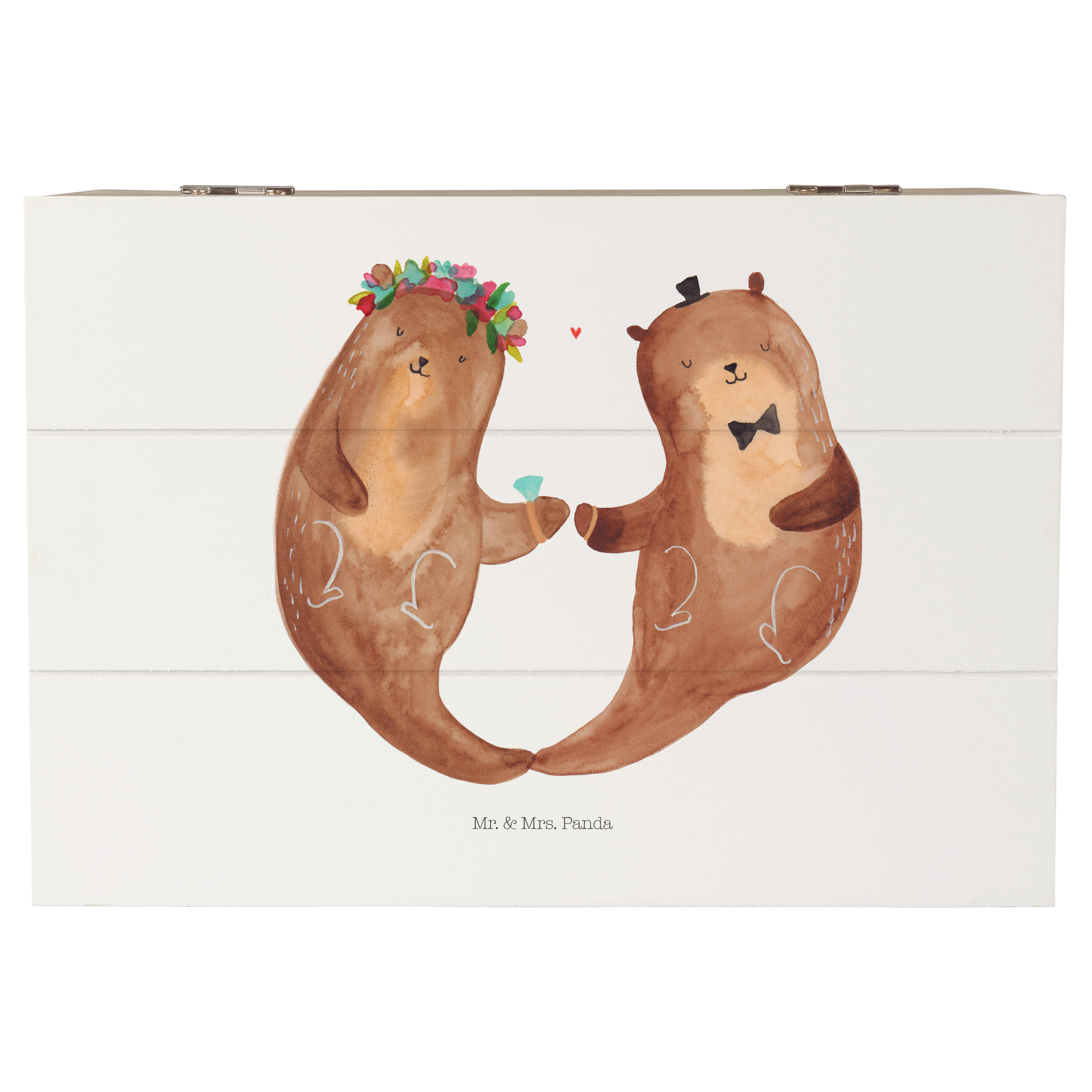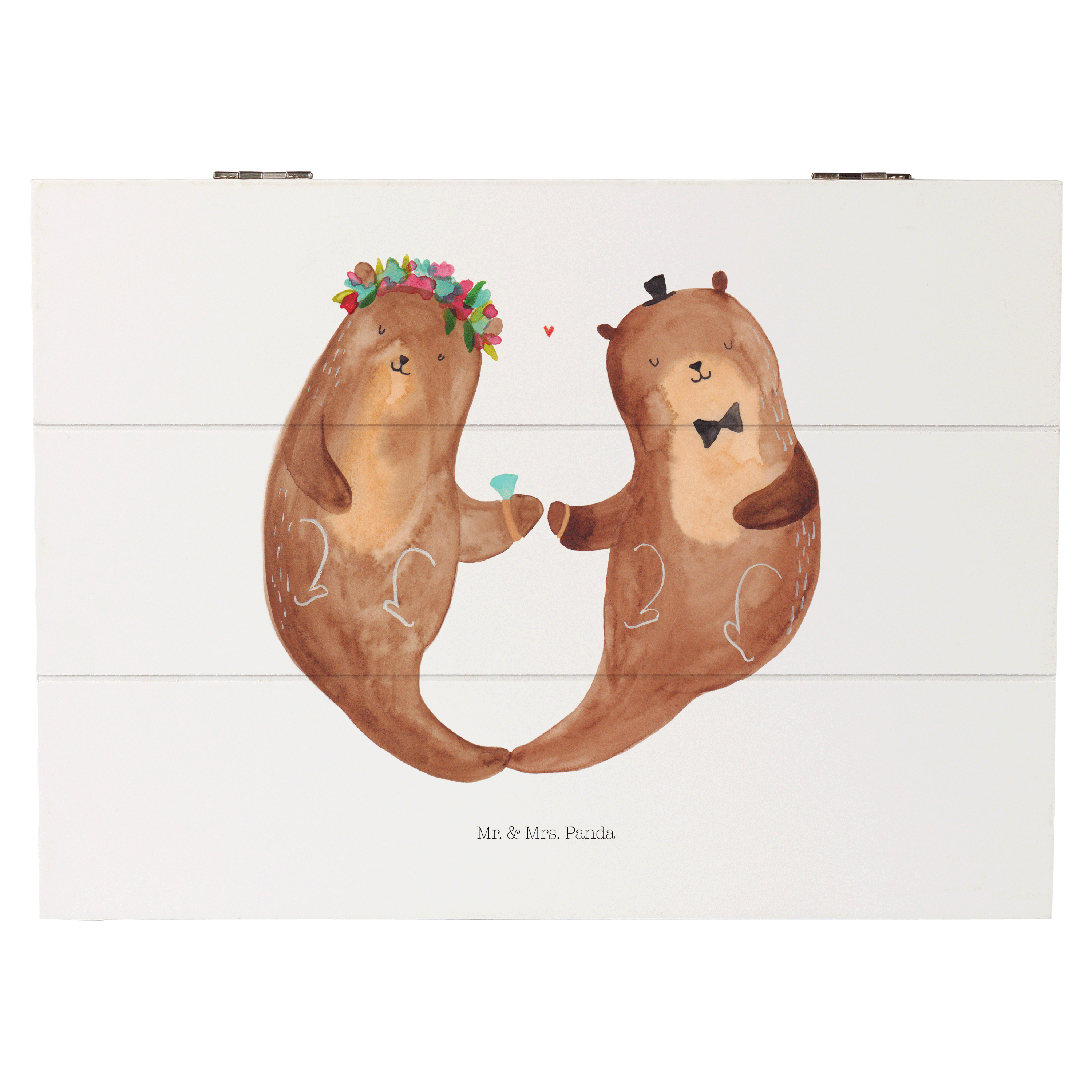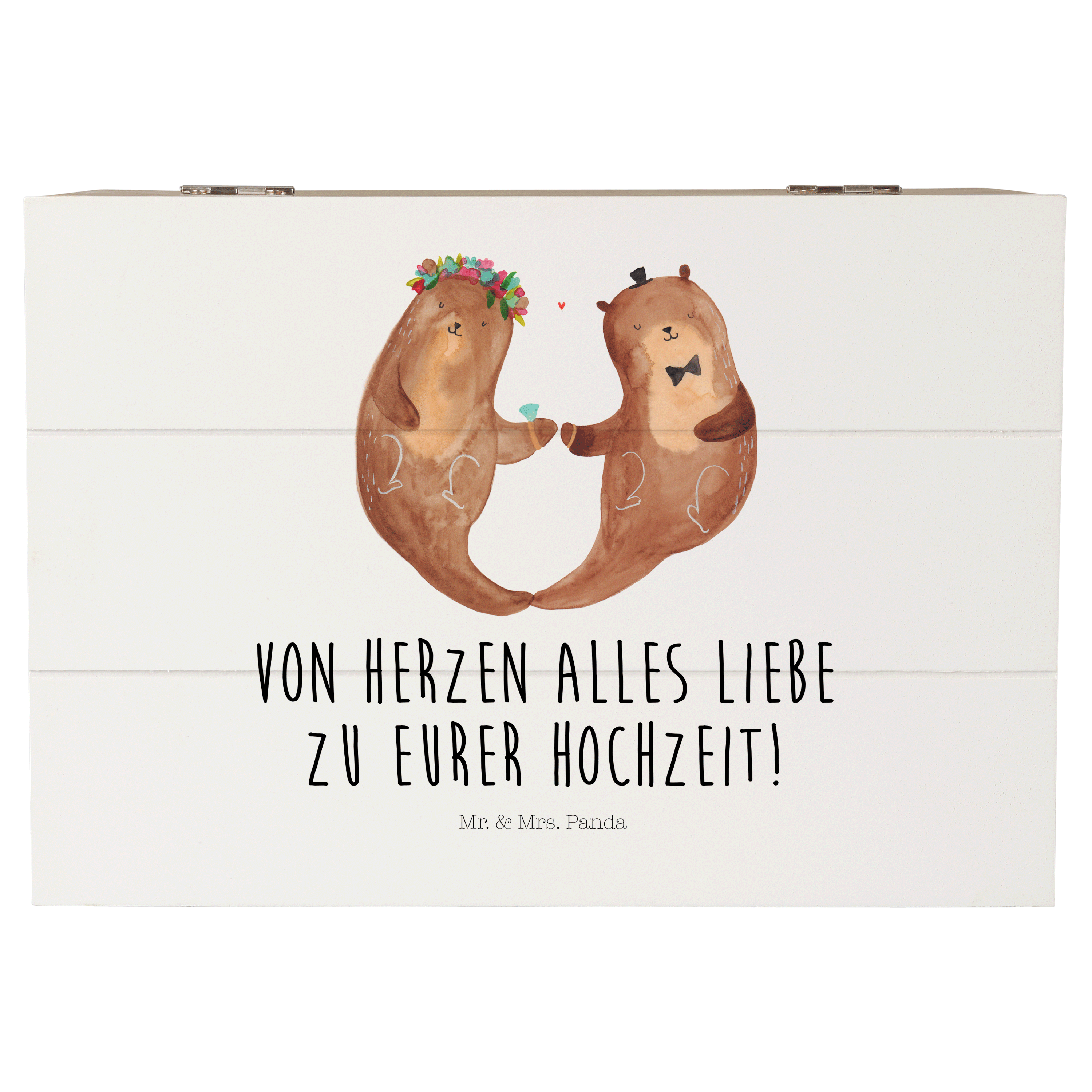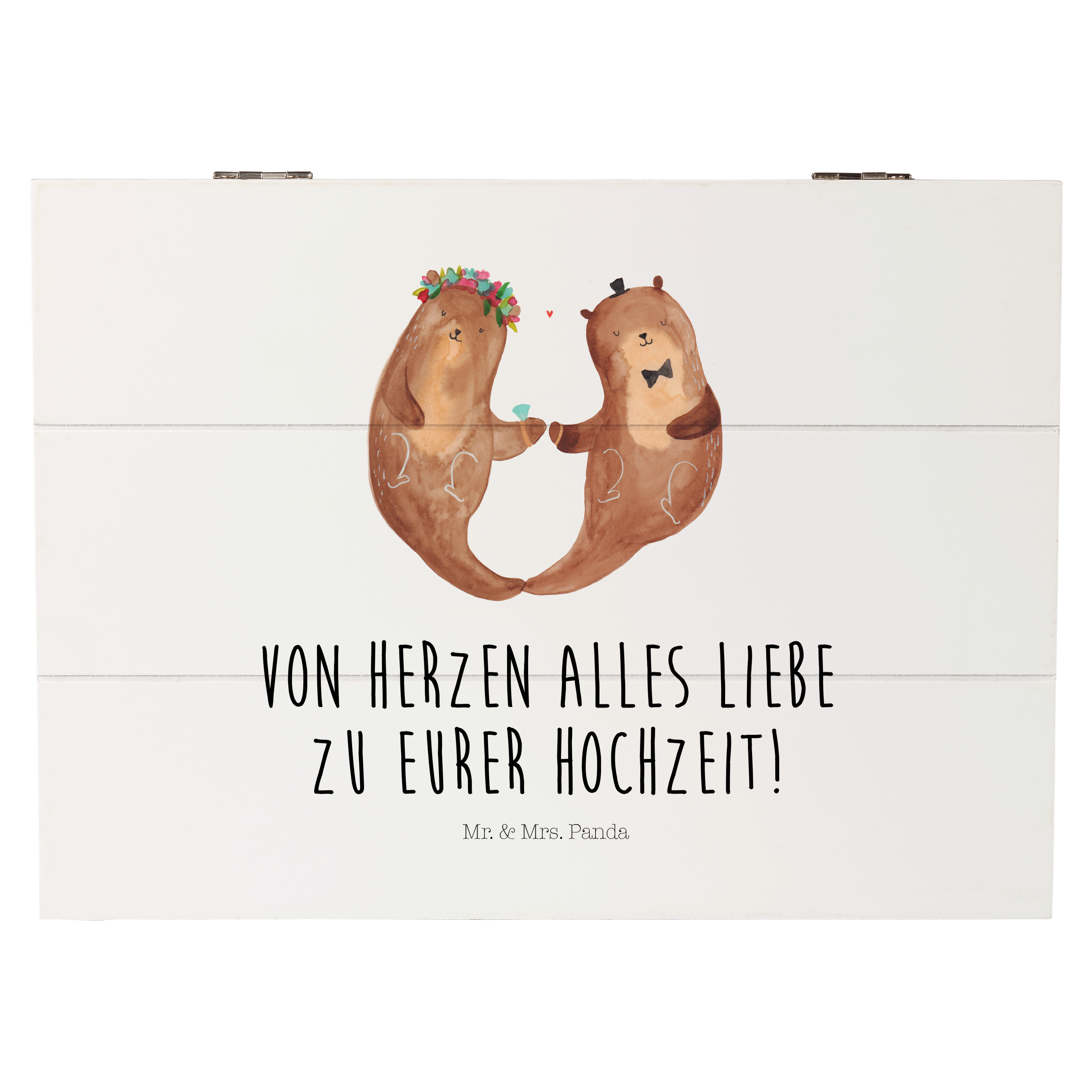 Erlebe die bedingungslose Liebe und die Verbundenheit des Hochzeitspaares Otter, das Händchen haltend seinen gemeinsamen Weg geht. Die süße Otter Frau trägt stolz einen Brautschleier und hat Blumen im Haar. Der charmante Otter Mann trägt stilvoll einen kleinen Hut und ein Einstecktuch. Mit viel Liebe wurde das Motiv von Mr. & Mrs. Panda in Aquarell gemalt.