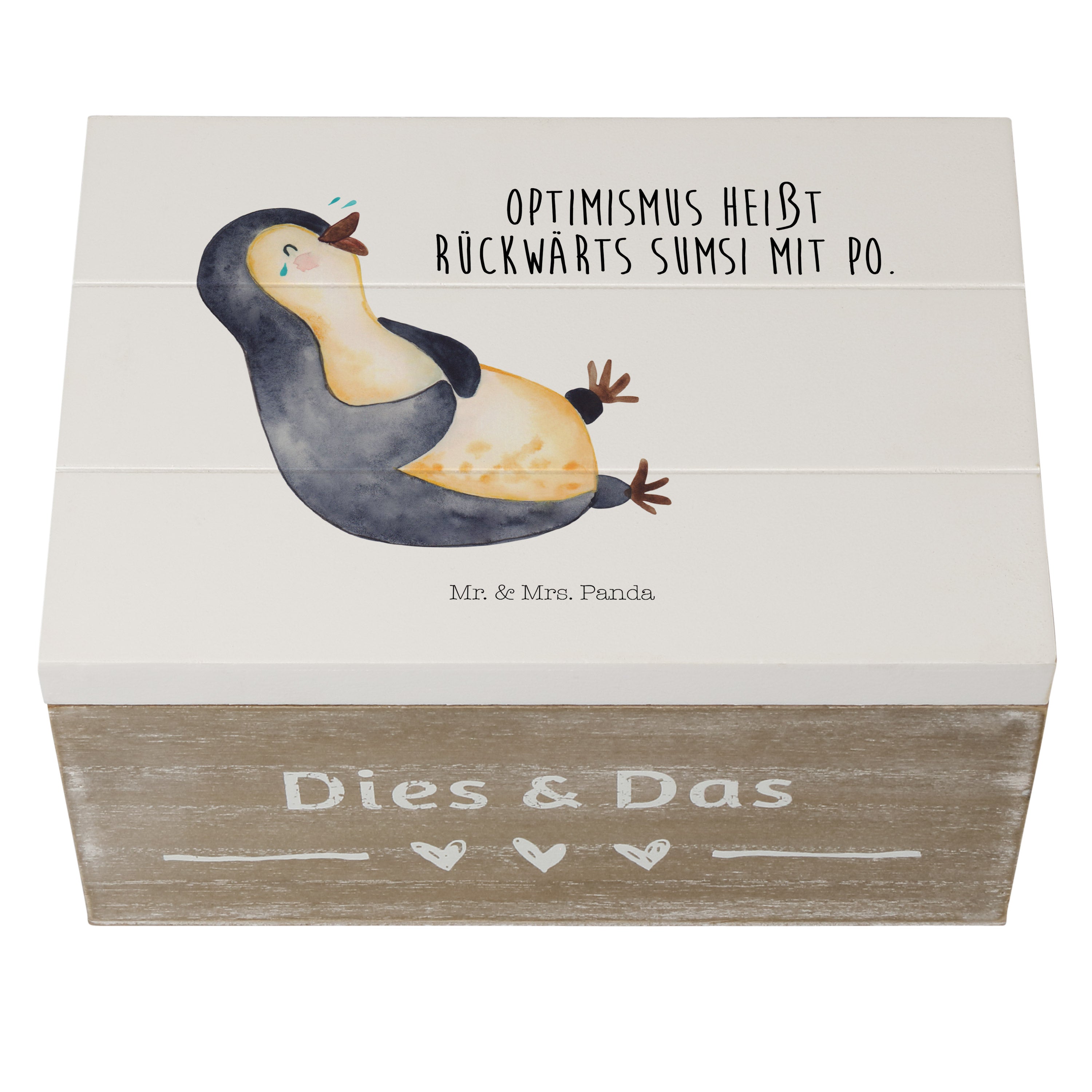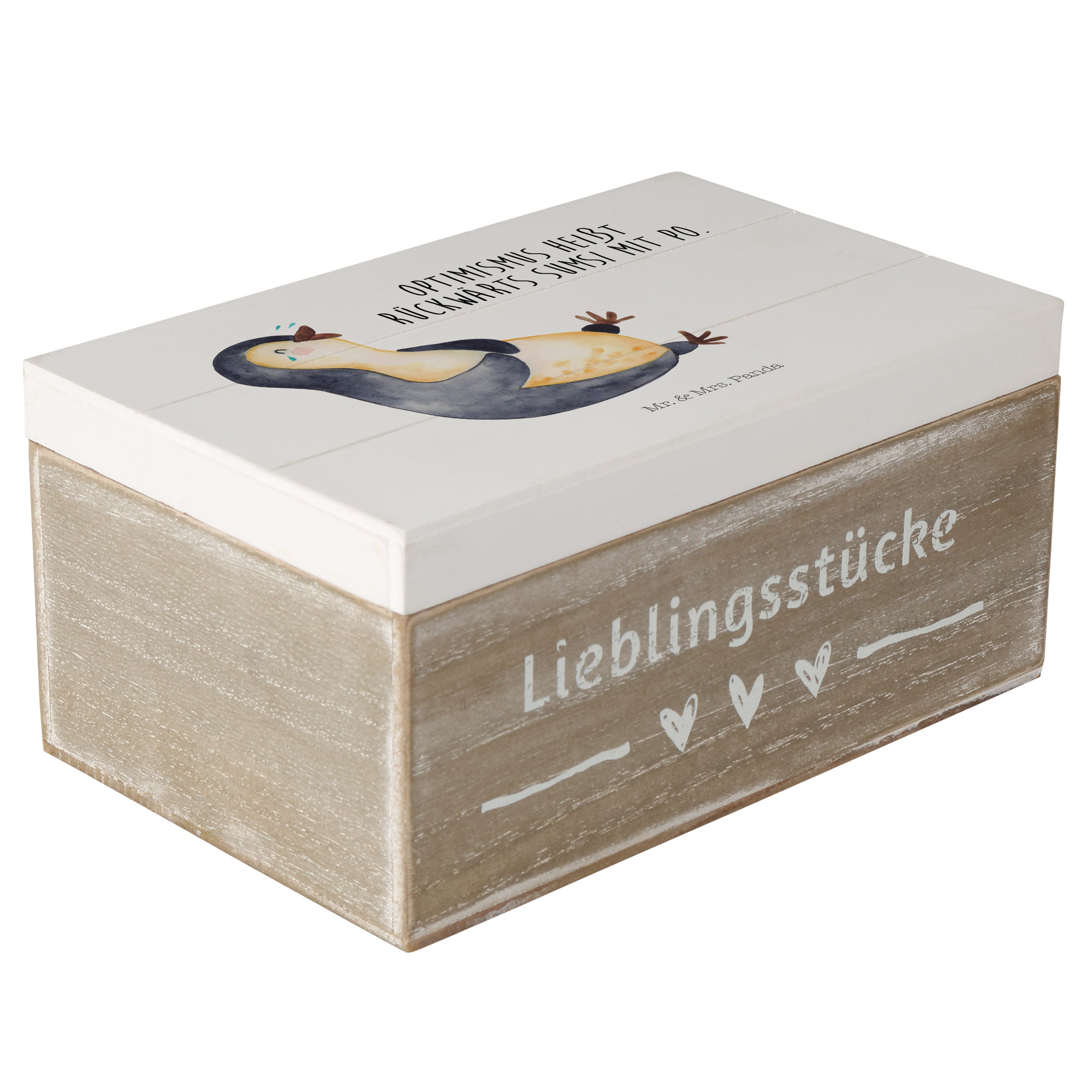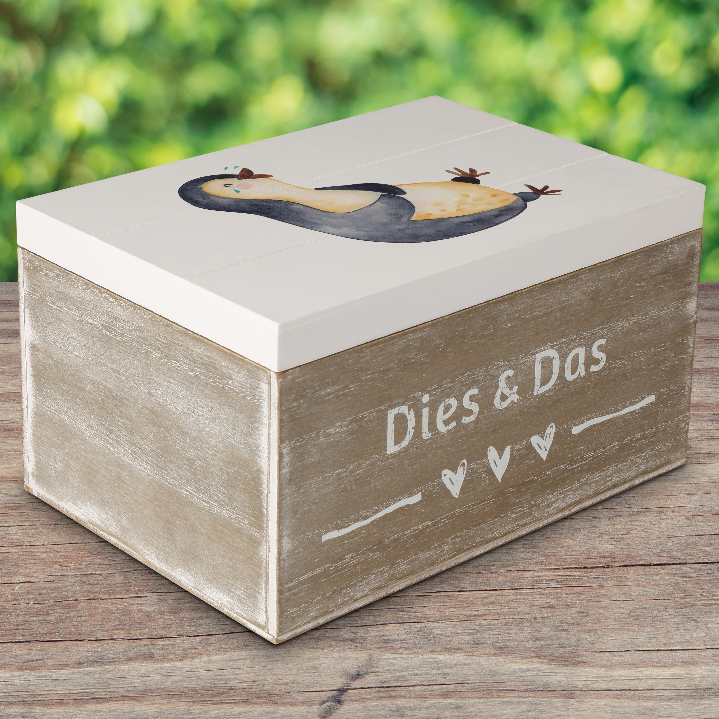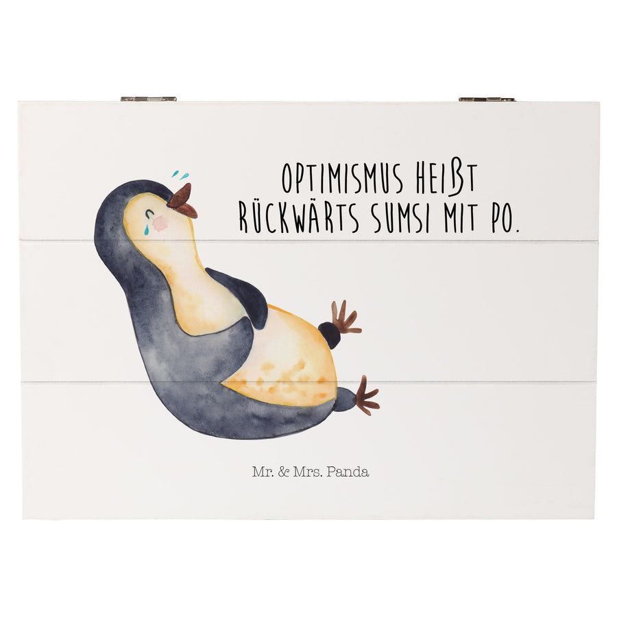 Holzkiste Pinguin lachend - 25 x 18 cm - mit Spruch - Weiß