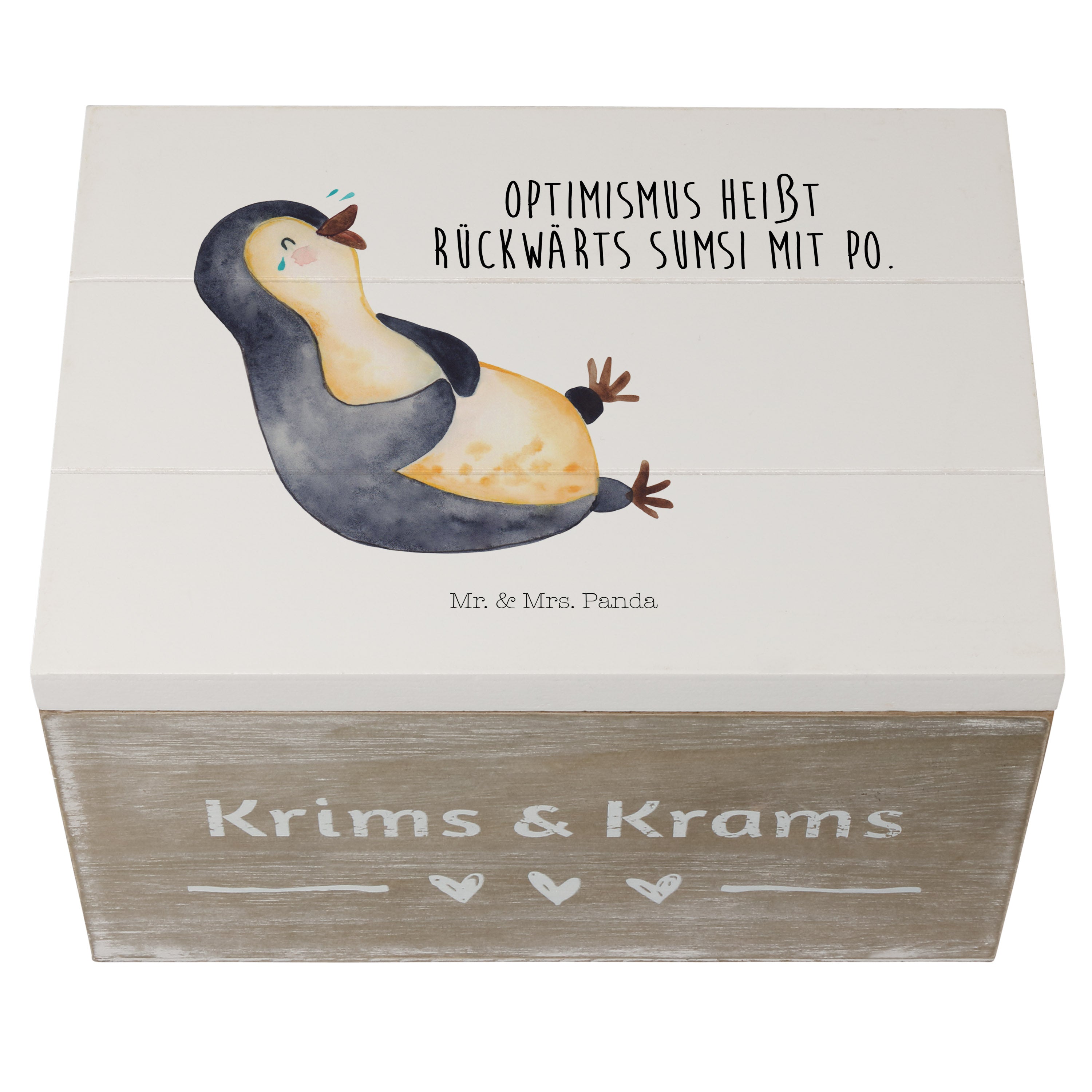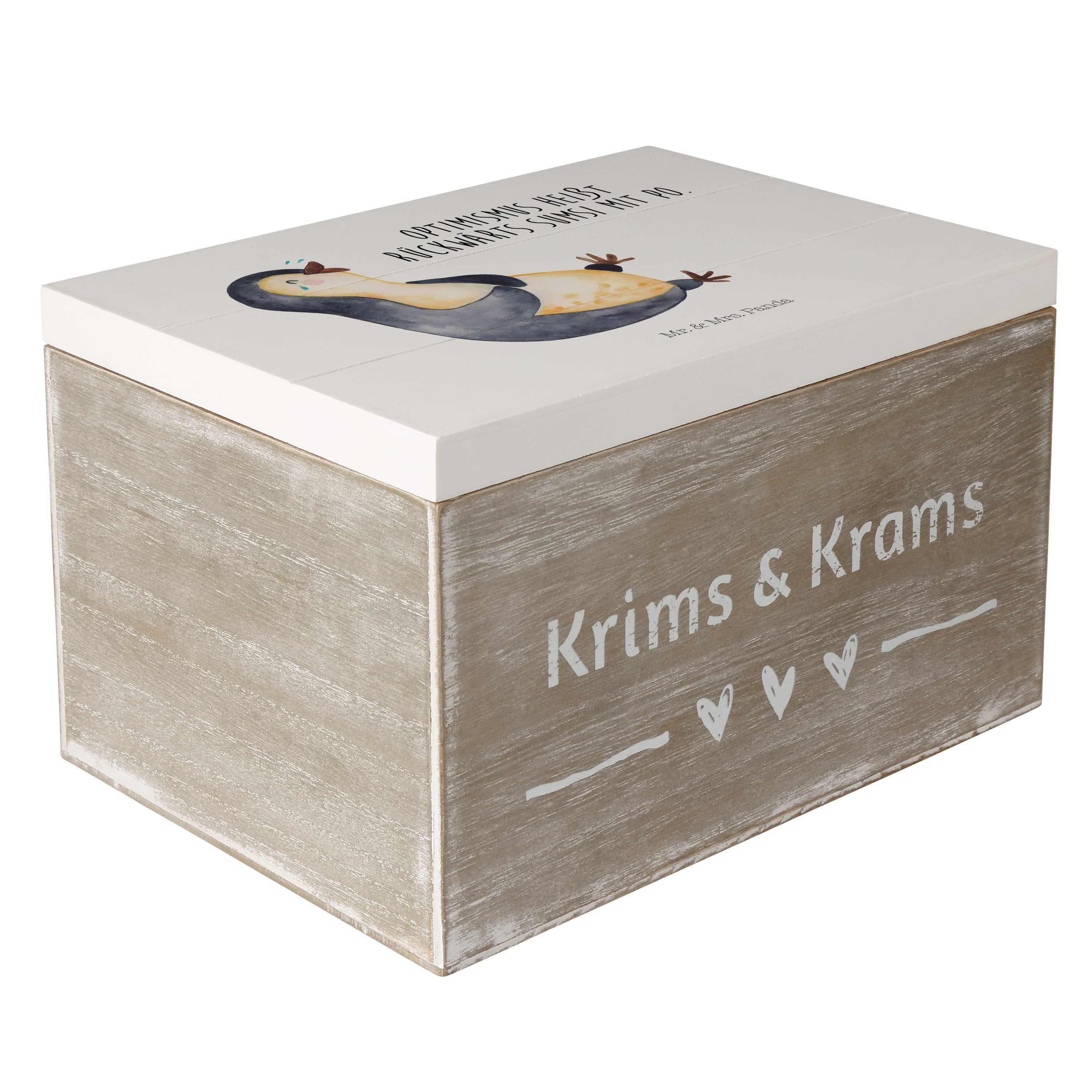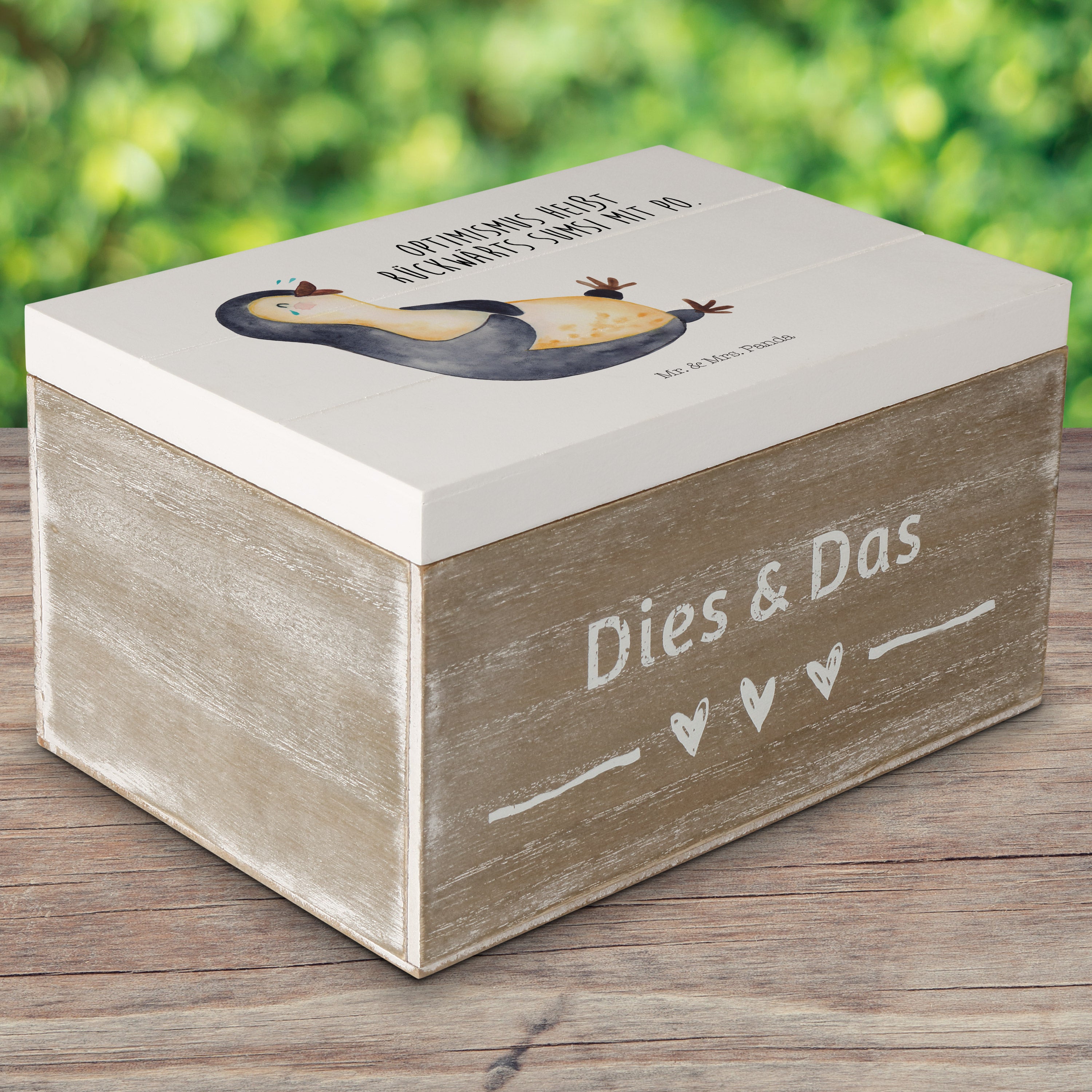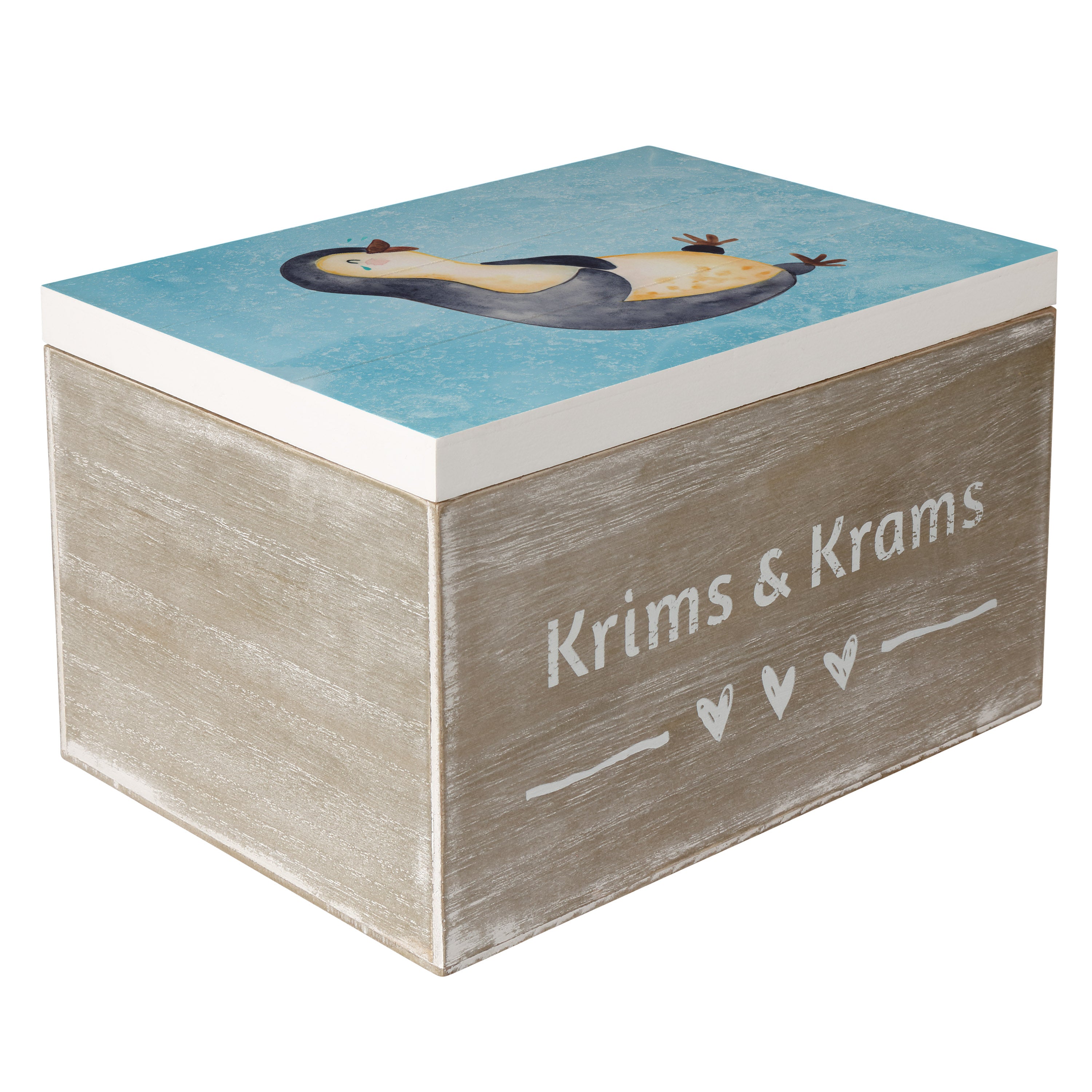 Holzkiste Pinguin lachend - 25 x 18 cm - mit Spruch - Weiß