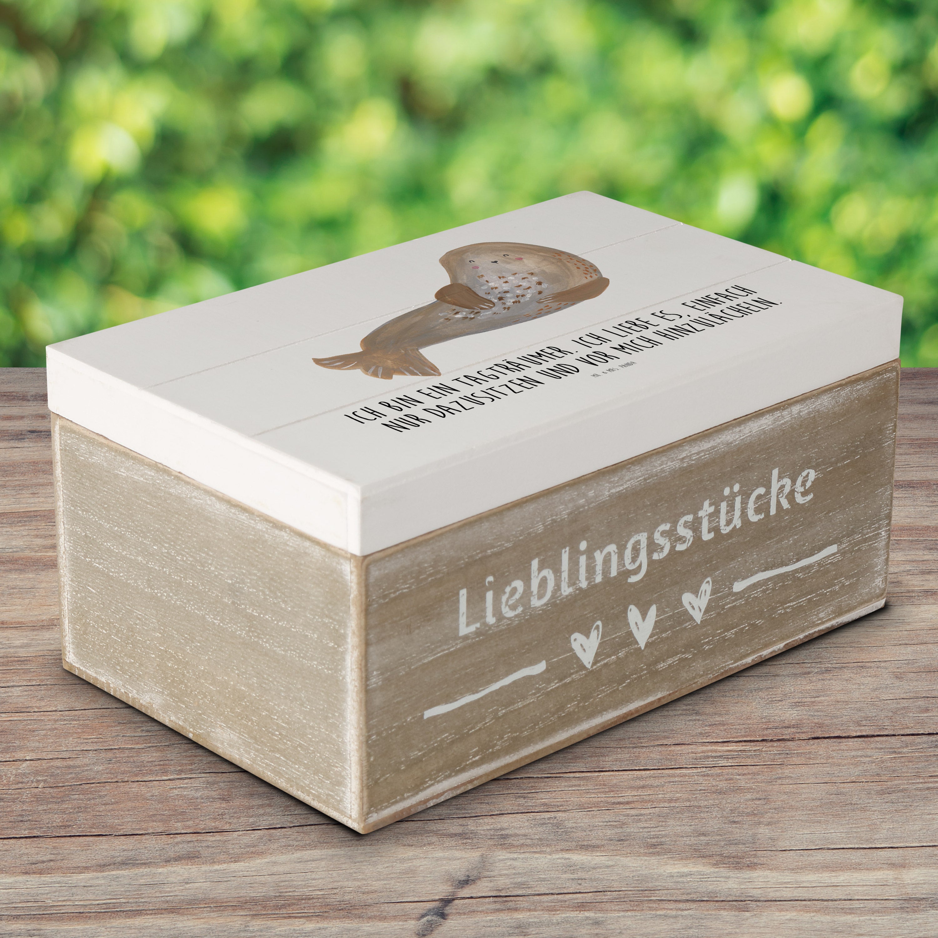 Holzkiste Robbe lachend - 25 x 18 cm - mit Spruch - Weiß