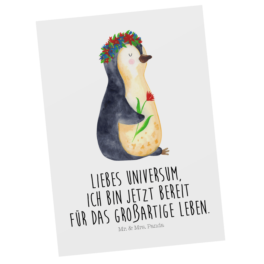 Postkarte Pinguin Blumenkranz Geschenkkarte, Grußkarte, Karte, Einladung, Ansichtskarte, Geburtstagskarte, Einladungskarte, Pinguin, Pinguine, Blumenkranz, Universum, Leben, Wünsche, Ziele, Lebensziele, Motivation, Lebenslust, Liebeskummer, Geschenkidee